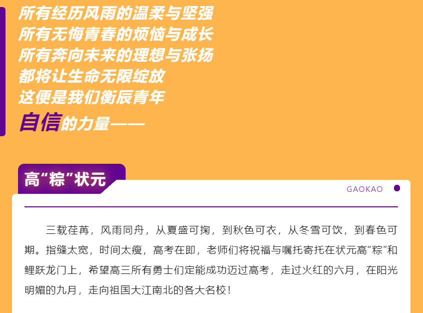 在这关键时刻,高三的你,正蓄势待发、全力奔跑。你奋斗的身影并不孤单,此时,衡辰的老师、同窗与你同行;彼时,衡辰学弟学妹们的奋斗身影也在与你重合。